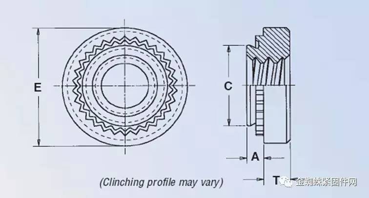 原理是通過壓花齒壓入鈑金的預置孔位,一般而言預置孔的孔徑略小于壓鉚螺母的壓花齒,通過壓力使壓鉚螺母的花齒擠入板內使導致孔的的周邊產生塑性變形,變形物被擠入導向槽,從而產生鎖緊的效果。 壓鉚螺母 ![]() 1、常見公制壓鉚螺母類型:vS-M3-0、CLS-M3-0;S-M3-1、CLS-M3-1;S-M3-2、CLS-M3-2vS-M4-0、CLS-M4-0;S-M4-1、CLS-M4-1;S-M4-2、CLS-M4-2vS-M5-0、CLS-M5-0;S-M5-1、CLS-M5-1;S-M5-2、CLS-M5-2 ![]()