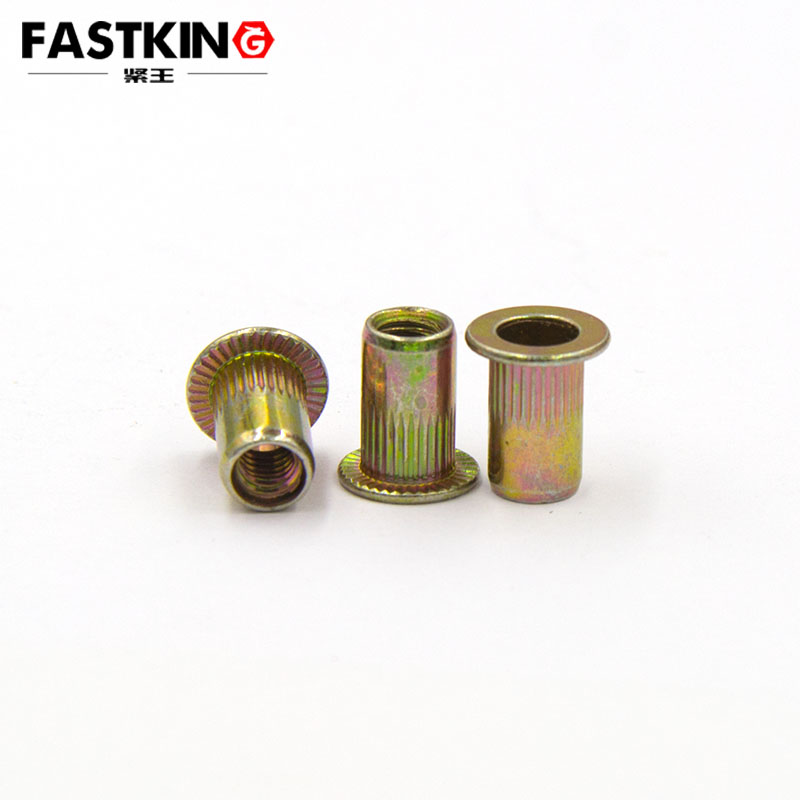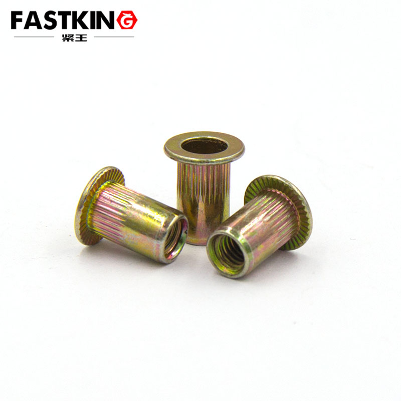在使用與選型過(guò)程中,需注意幾個(gè)關(guān)鍵要點(diǎn)以充分發(fā)揮彩鋅拉鉚螺母的性能。首先是根據(jù)工件材質(zhì)與厚度選擇合適規(guī)格:若工件為鋁合金、塑料等軟質(zhì)材料,應(yīng)選擇鉚接段較長(zhǎng)、法蘭邊較大的型號(hào),以增大接觸面積,避免工件被壓傷;若工件厚度較薄(<1mm),則需選擇薄壁型螺母,防止鉚接時(shí)工件過(guò)度變形。其次是注意安裝時(shí)的拉力控制:拉力過(guò)小會(huì)導(dǎo)致鉚接不牢固,拉力過(guò)大則可能使螺母斷裂或工件變形,需根據(jù)螺母規(guī)格(如 M3、M8)與工件材質(zhì),參照廠家提供的拉力參數(shù)調(diào)整拉鉚槍壓力,確保鉚接效果。最后是避免在強(qiáng)腐蝕環(huán)境中濫用:雖然彩鋅鍍層的防腐蝕性較強(qiáng),但在強(qiáng)酸、強(qiáng)堿(如化工車間、海邊高鹽霧環(huán)境)中,仍建議選擇不銹鋼材質(zhì)或額外做防腐處理,以免鍍層快速失效導(dǎo)致螺母銹蝕。